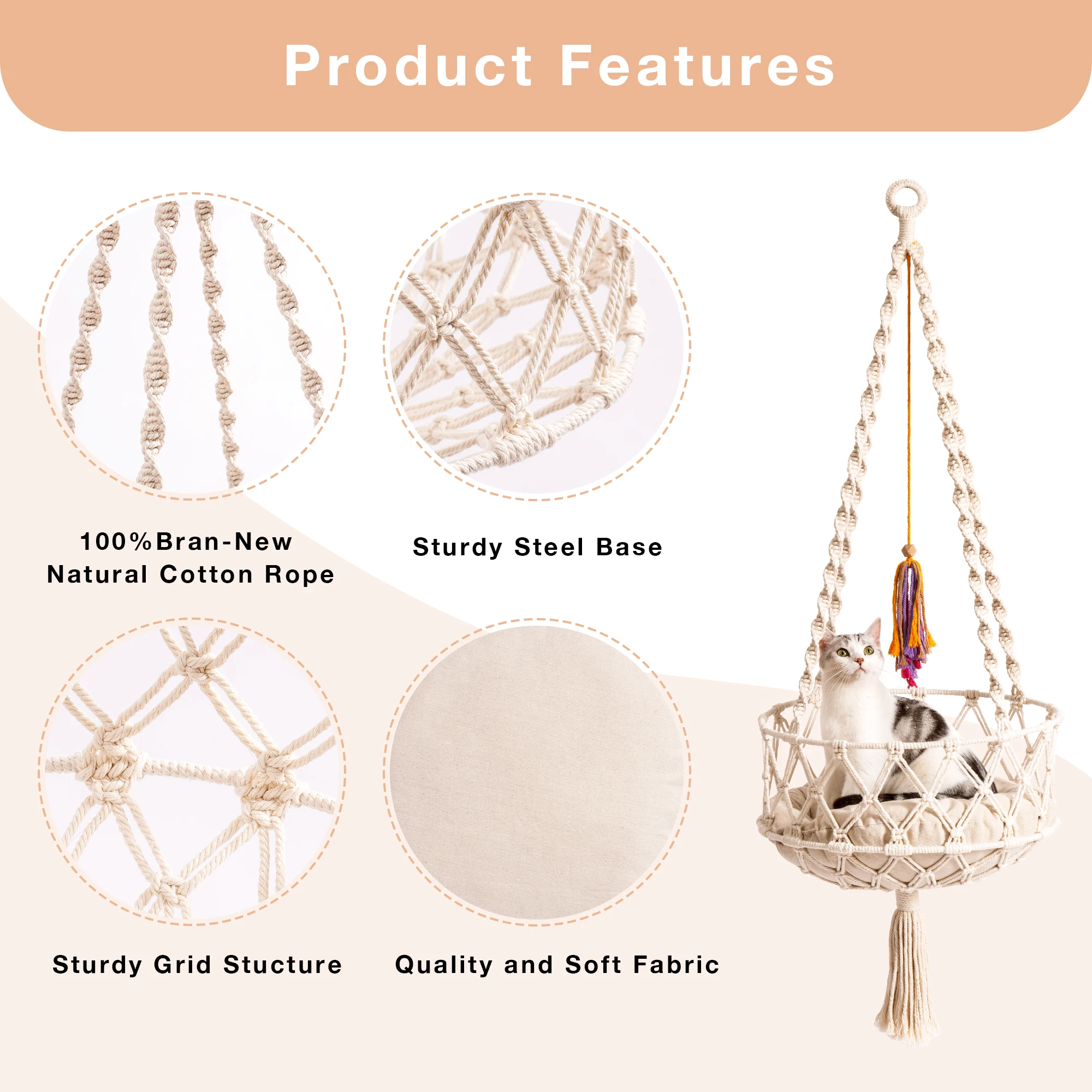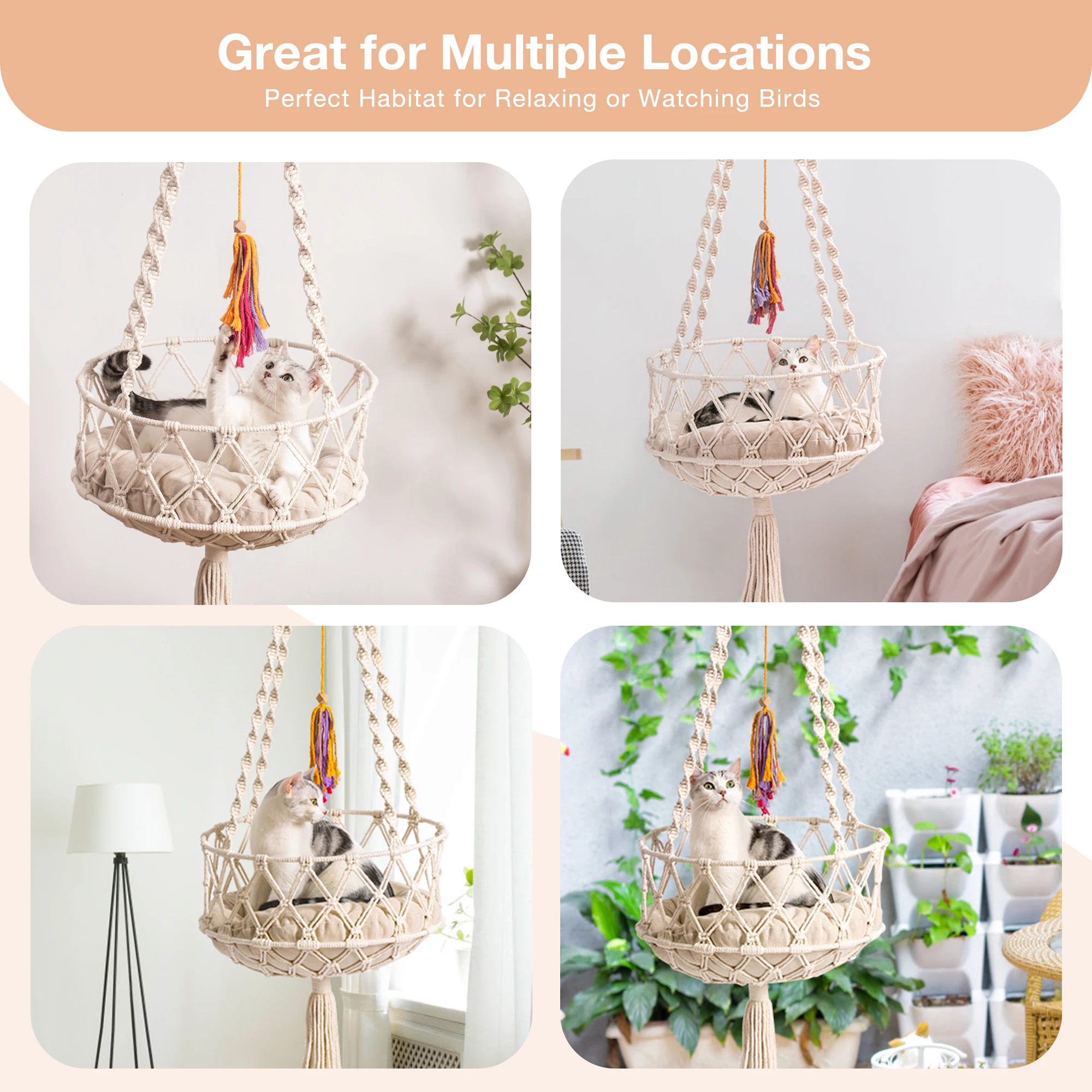 • 【Mewoofun Cat bed】Unique design bohemian-style cat swing bed, unique appearance, combined with tassel pendants, this cat bed is stylish and simple, equipped with woven mat, providing a comfortable habitat for cats , also add a touch of beauty to the home.