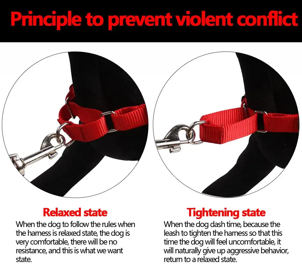 Traditional harnesses can actually encourage dogs to pull harder because of the opposition reflex. Thats the reflex that makes sled dogs do what they do. TheEasy Walk Harness’ unique front-chestleash attachment stops pulling by tightening slightly across your dog’s chest and shoulder blades.The gentle pressure steers your dog to the sideand redirecting his attention back towards you.The Easy Walk Harness never causes coughing, gagging, or choking because the chest strap rests low across the breastbone, not on the delicate tracheal area.