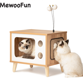 Mewoofun Cat House Wooden Condo Bed Indoor TV-Shaped Sturdy Large Luxury Cat Shelter Furniture with Cushion Cat Scratcher US